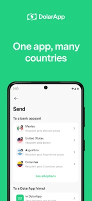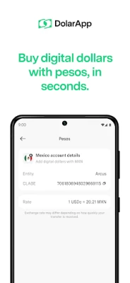 Download and sign up for DolarApp in minutes. The registration process is simple and fast so you can start using DolarApp right away. Send pesos to your DolarApp CLABE (Mexico) or CVU/Alias (Argentina) number or add via PSE (Colombia) and you will get digital dollars instantly. It's that easy. No waiting in line, no need to carry cash. Open your comission-free account in seconds.