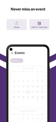 NEVER MISS AN EVENT The event section shows a list of events throughout the district. Users can add an event to their calendar to share the event with friends and family with one tap.