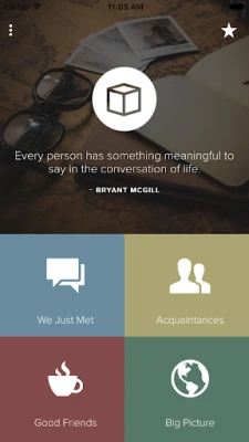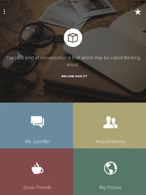 The Questions In A Box app provides you with hundreds of great conversation starting questions using a fun and intuitive interface. Use these conversation starters at restaurants with friends, around the dinner table with family, or to get to know neighbors and co-workers.