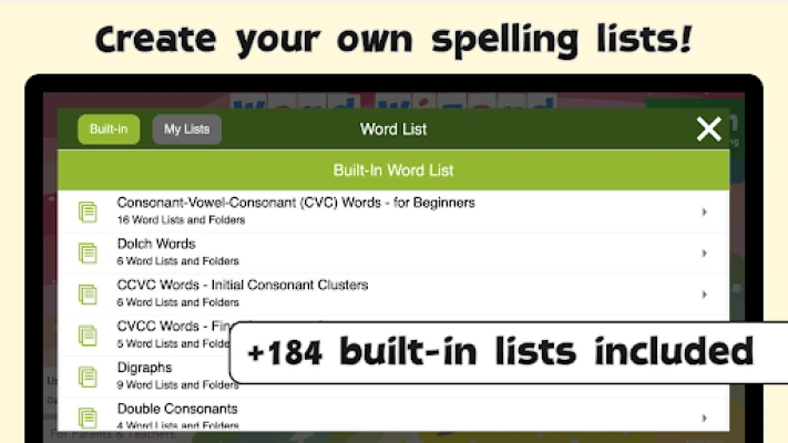 • 184 built-in word lists of 10 words: Words for beginners, Dolch Words (sight words), 1,000 most frequently used words, body parts and more