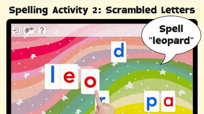 2 - "Scrambled Letters" says the word and displays the letters needed to build the word or sentence, and asks the child to reorder the letters.
